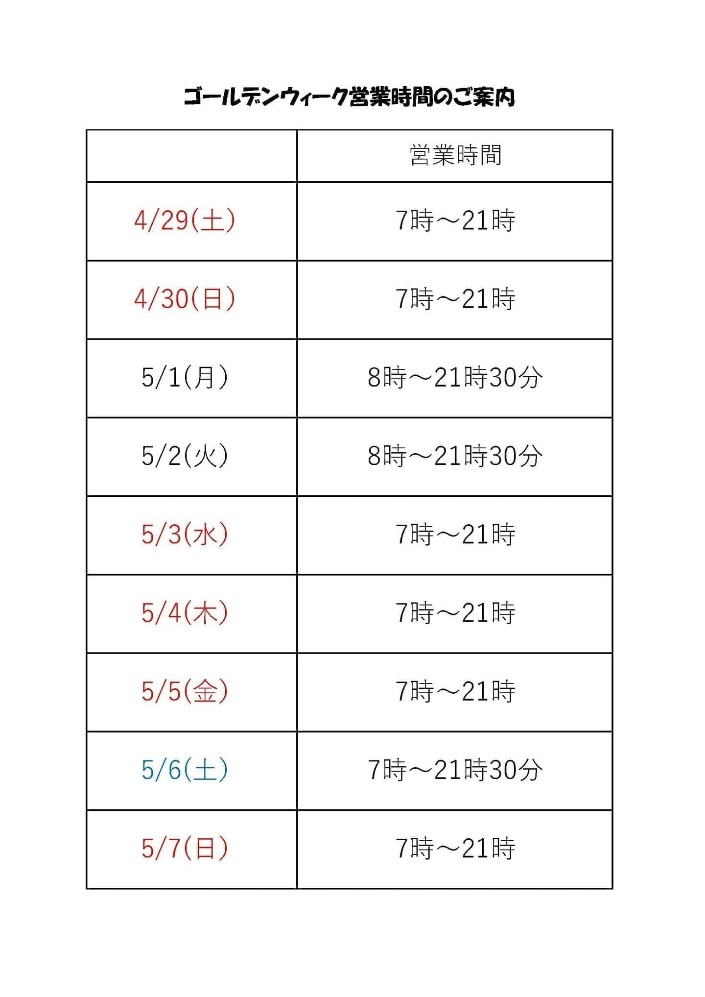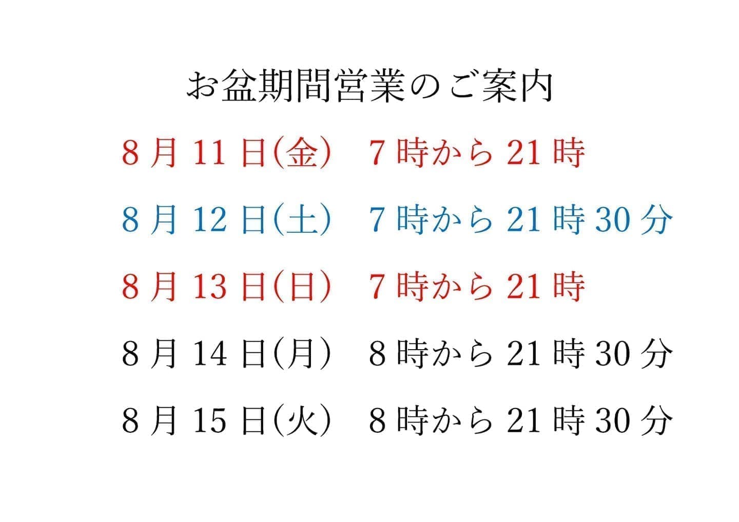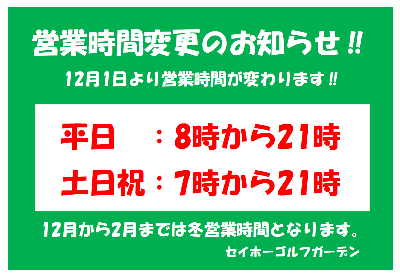 【12月~2月】平日 8:00-21:00・土曜日 7:00-21:00・日祝 7:00-21:00