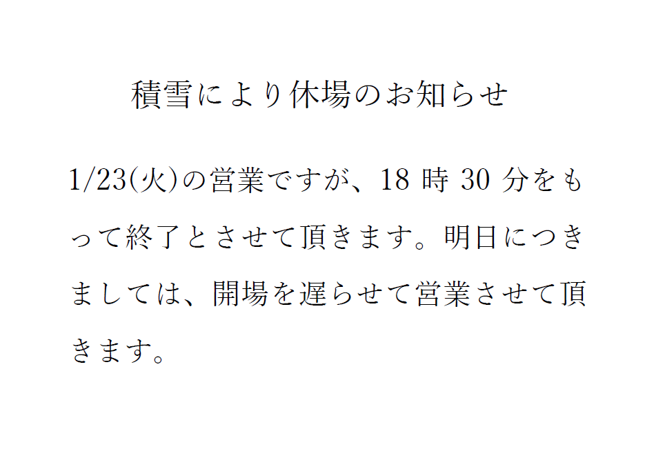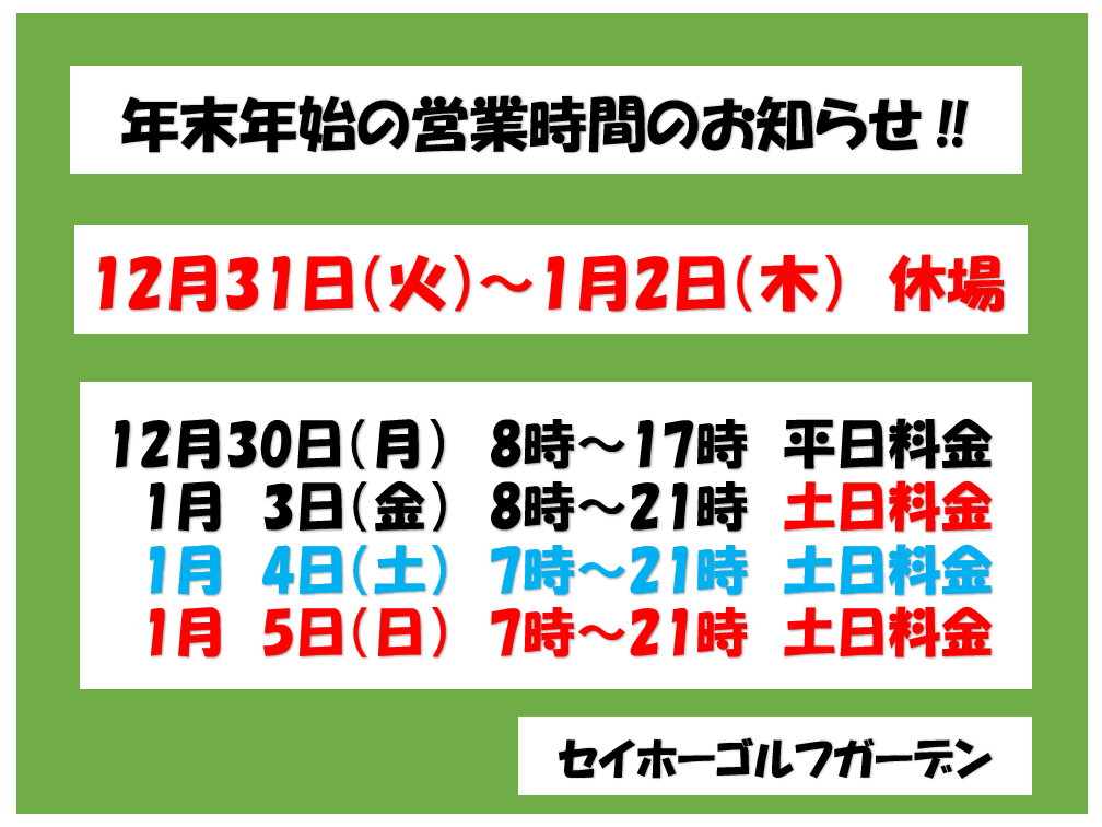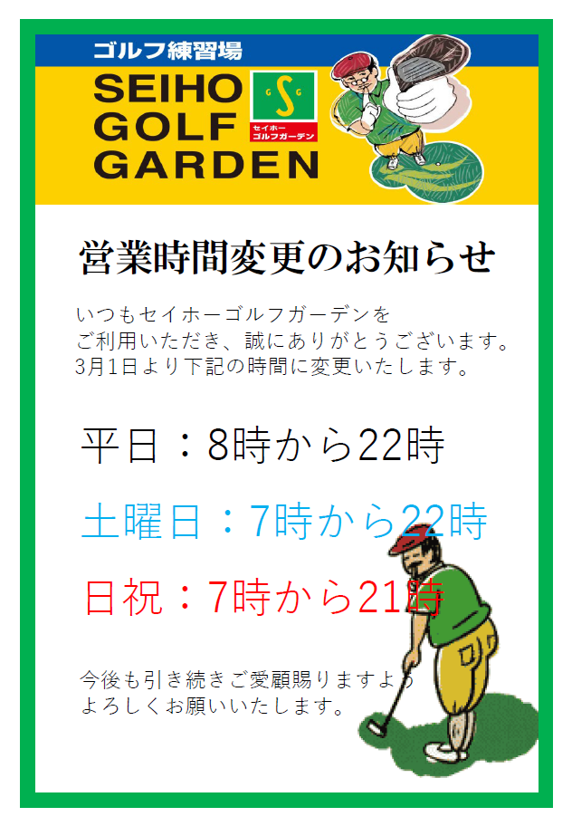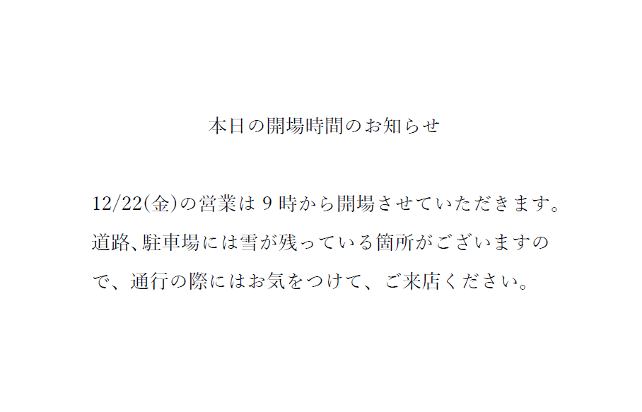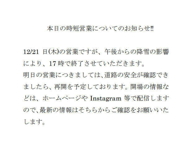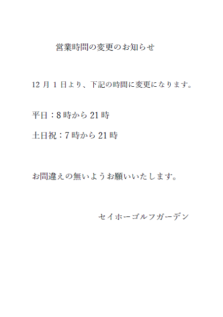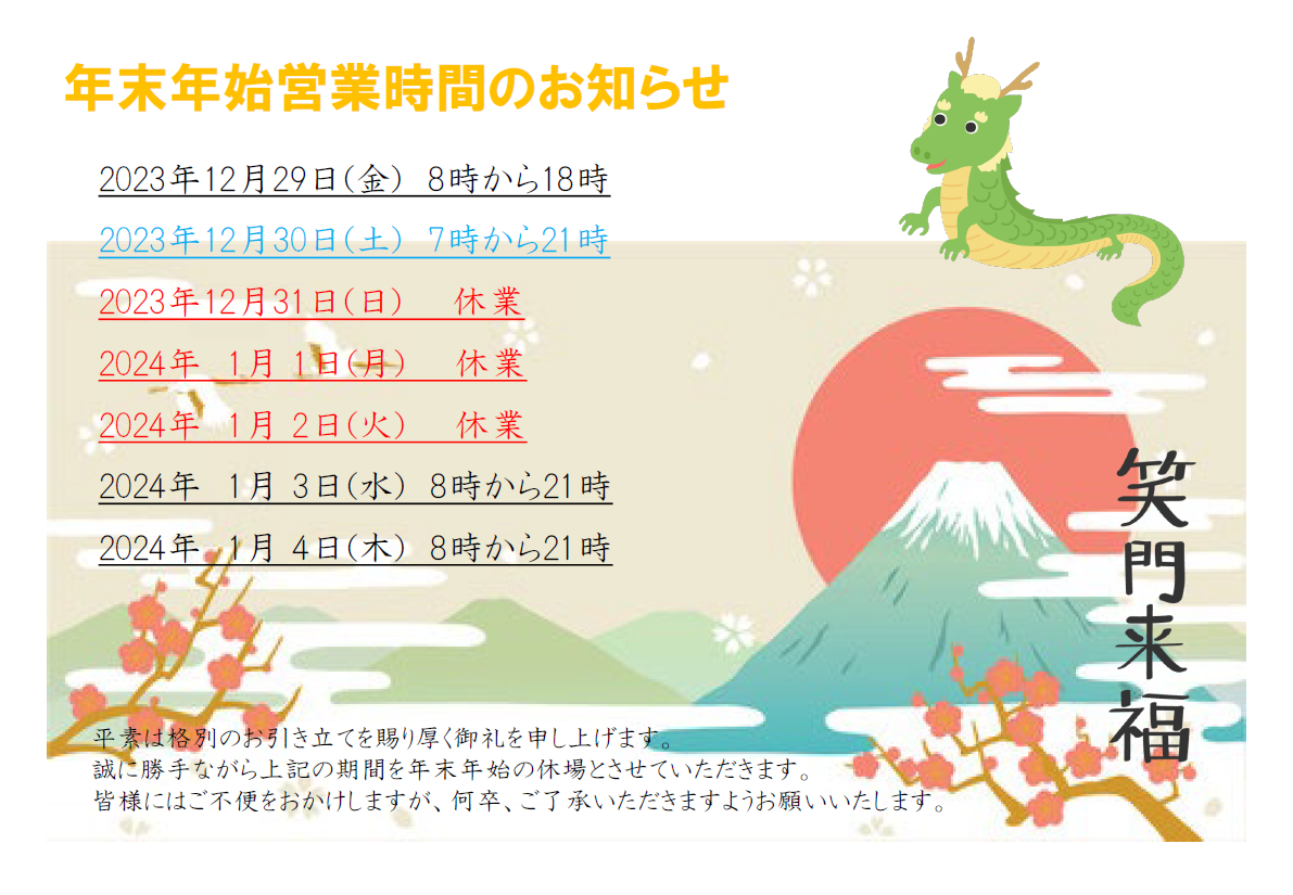 【12月~2月】平日 8:00-21:00・土曜日 7:00-21:00・日祝 7:00-21:00