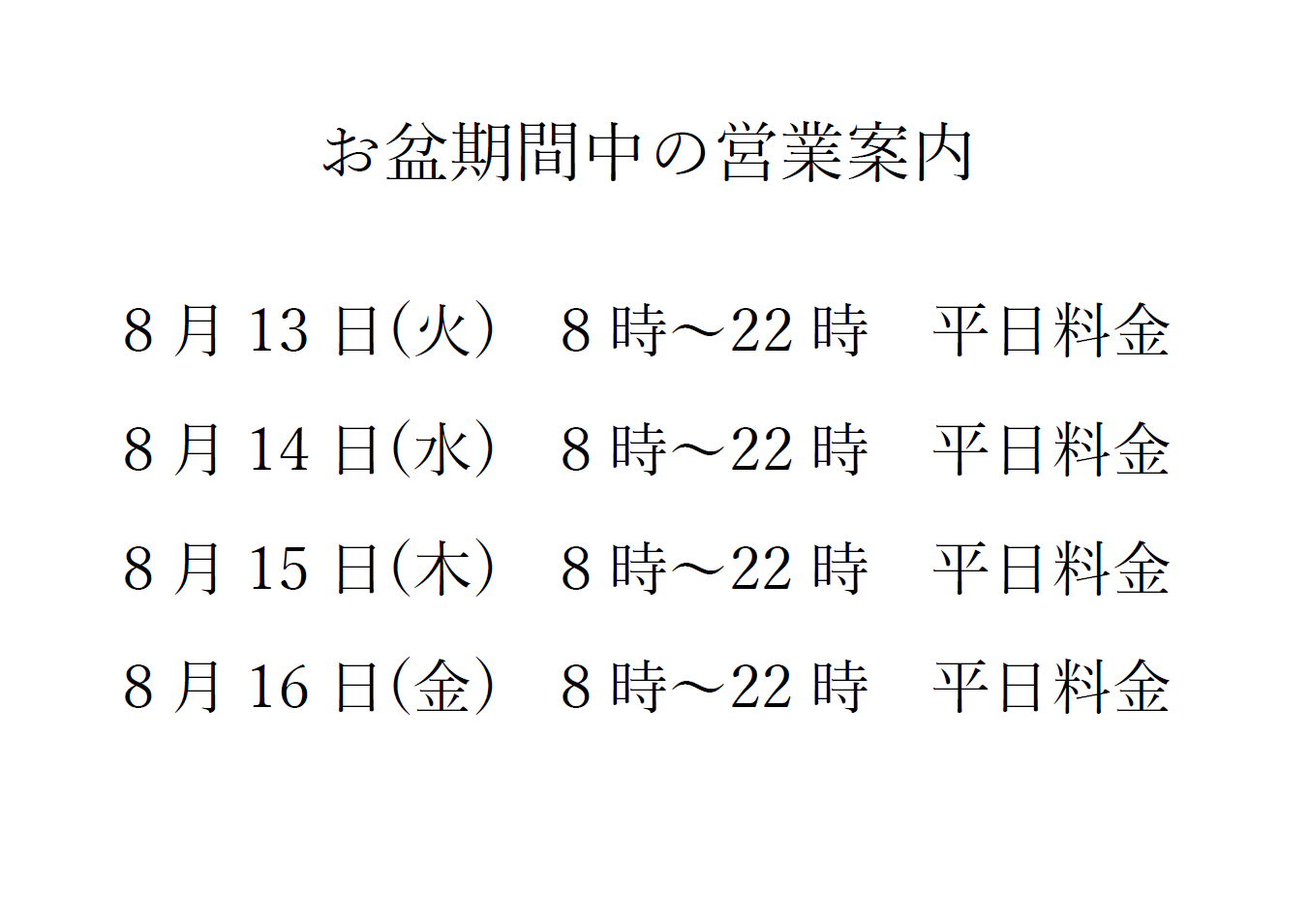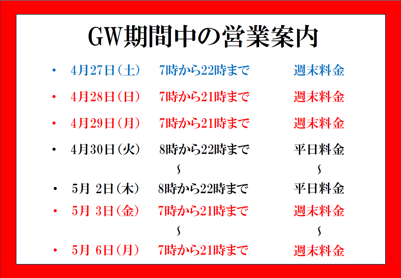【3月~11月】平日 8:00-22:00・土曜日 7:00-22:00・日祝 7:00-21:00